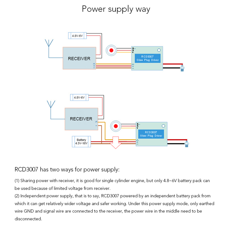 RCD3007 je najvýkonnejší ovládač pre žhaviacu sviečku, môže sa spustiť pomocou externého spúšťacieho tlačidla alebo diaľkovým ovládaním na spustenie napájania žhavenia, zariadenie môže úplne nahradiť tradičnú ručnú žhaviacu trubku a to prostredníctvom napájania prijímača, ale aj nezávislého napájania, akéhokoľvek viacvalcového motora. Toto zariadenie sa dá ovládať zadaním voľného prepínacieho kanála diaľkového ovládania. Zariadenie má tiež detekciu tepelného výkonu, keď je tepelný výkon slabý alebo vysoký, kontrolka výkonu bude mať zodpovedajúcu indikáciu. Prístroj používa mikrokontrolér na dosiahnutie riadiacej logiky, a použitie efektívneho synchrónneho usmerňovacieho čipu a ultra-nízkeho odporu výkonového zariadenia, účinnosť až 95%, takže teplo je veľmi malé, môže dosiahnuť manuálne, automatické, diaľkové , polovičný výkon, plný výkon a ďalšie funkcie. Prístroj má konštantné napätie na výstupe 1,4V, podľa pracovných podmienok žhaviacej sviečky automaticky upravuje výstupný prúd, aby sa zabezpečilo, že žhaviaca sviečka má najlepšiu pracovnú teplotu, dokonca aj vtedy ked je žaviaca sviečka úplne ponorená do paliva. , stále je schopný udržať normálnu teplotu. Prístroj má tiež skratový a prehrievací ochranný mechanizmus, nemusíte sa obávať, pretože skrat záťaže (tepelná hlava) spôsobený horením zariadenia pri nepretržitom používaní procesu, ak je teplota príliš vysoká, systém vstúpi do ochranného stavu sa teplota vráti do normálu.