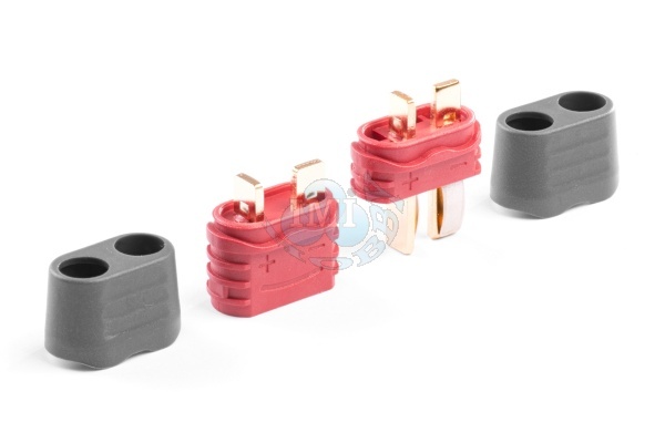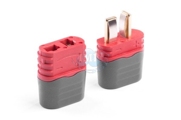 Dvojkolíkový silový konektor s plochými pozlátenými kontaktmi so zaťažiteľnosťou max. 50 A (dlohodobo 25A) so zaobleným drážkovaným telom pre pevnejšie uchopenie a kryty káblov. Pre káble s prierezom max. 3,3 mm2 (12AWG). Prechodový odpor 0,45 mOhm, max. 500 V. |