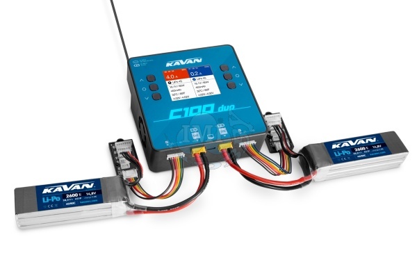 Malý dvojkanálový nabíjač KAVAN C100 Duo 2x500W bol konštruovaný so snahou ponúknuť inteligentný nabíjač s vysokým výkonom s napájaním zo siete aj autobatérie a veľmi jednoduchou a prehľadnou obsluhou. C100 Duo umožňuje nabíjať a vybíjať bežné typy článkov (NiCd, NiMH, LiPo, LiHV, ULiHV, Li-ion, LiFe, Pb), navyše je vybavený vstavanými šesťkanálovými balancermi, ktoré zaisťujú bezpečné nabíjanie lítiových akumulátorov. Nabíjač je vybavený farebným LCD displejom a programovacími tlačidlami, ktoré vám poskytnú možnosť komfortného a veľmi prehľadného nastavovania parametrov, riadenia a sledovania priebehu nabíjania/vybíjania. Medzi voliteľnými jazykmi menu samozrejme nechýba ani čeština.