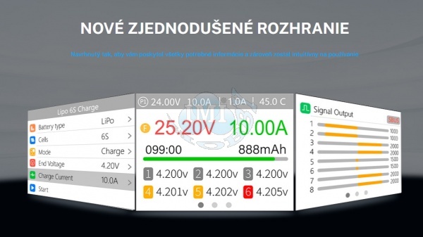 Typ batérie LiPo, LiHV, LiFe, Lion pri 1 – 6 S NiMh pri 1 – 16 S Pb pri 1 – 10 S