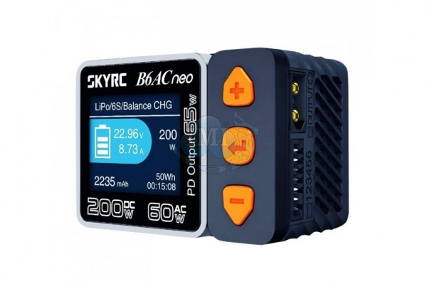 Výkonný vreckový mikroprocesorý rýchlonabíjač s balancerom pre 1-15 čl. NiCd/NiMH, 1-6 čl. LiPo/Li-ión/LiFe/LiHV, 6/12V Pb prúdom 0,2-10A (max. 200W). Vybíjanie 0,1-2A (max. 5W). Napájanie 10-30 V. Meranie vnútorného odporu, režim stabilizovaného zdroja 2-27V/1-10A, výstup USB-C QC3.0/PD 5-20V/max. 65W. Miniatúrny nabíjač SKY RC B6ACneo 200W bol konštruovaný so snahou poskytnúť všetko potrebné na nabíjanie vrátane sieťového zdroja, s jednoduchou obsluhou, pri veľkosti „na pol dlane“. B6ACneo umožňuje nabíjať a vybíjať bežné typy článkov (NiCd, NiMH, Li-poly, Li-ión, Li-Fe, Li-HV, Pb), navyše je vybavený vstavaným šesťkanálovým balancerom, ktorý zaisťuje veľmi bezpečné a komfortné nabíjanie lítiových akumulátorov. Môže tiež pracovať v režime regulovaného napájacieho zdroja s výstupným napätím nastaviteľným v rozmedzí 2-27 V a prúdom 1-10 A alebo nabíjať smartfóny, tablety a podobné zariadenia prostredníctvom USB-C výstupu podporujúceho protokoly QC3.0/PD.