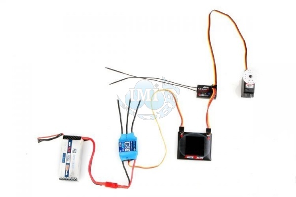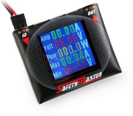 Přesný wattmetr 0,1-10A/4-8,4V pro měření odběru v palubní síti RC modelů, popř. malých elektropohonů. S digitálním zobrazením proudu, napětí, příkonu/výkonu i proteklého náboje a grafickým zobrazením průběhu proudového odběru v čase. SafetyMaster je unikátní měřící přístroj - wattmetr 0,1-10,0 A s digitálním a grafickým zobrazením - který vám pomůže spolehlivě prověřit, jak kvalitní je systém napájení vašeho RC modelu. "Měkké" akumulátory a "neduživé" BEC stabilizátory jsou často tím "nejslabším článkem" palubní elektroniky a jednou z hlavních příčin havárií. Se SafetyMasterem uvidíte, jak bezpečný je váš systém napájení - díky měření proudu odebíraného servy a přijímačem a díky sledování napětí akumulátoru nebo BEC stabilizátoru při zatížení. A nejenom to, kromě odečtu okamžité hodnoty proudu SafetyMaster umožňuje zobrazovat průběh odebíraného proudu jako graf v závislosti na čase! Nízká hmotnost (sotva 14 g) a rozměry do dlaně dokonce umožňují SafetyMaster umístit na palubu a "natočit" průběh odběru v palubní síti nebo třeba jen jednoho serva za letu nebo jízdy! Do ruky tak dostáváte sofistikovaný měřící přístroj - grafický analyzér, s nímž prověříte odběr všech částí palubního RC vybavení jako nikdy předtím! V klidu domácí dílny, stejně jako v "polních podmínkách" na letišti, bez nutnosti vláčet s sebou počítač nebo jiné drahé vybavení pro zobrazení průběhu proudu. SafetyMaster je samozřejmě také možno použít pro měření odběru malých pohonných systémů (do 10 A a napětí 8,4 V - tj. 2s Li-Po). SafetyMaster je uložen v malém plochém pouzdru s dominujícím LCD displejem na čelním panelu. Na horní straně jsou umístěny vstupní a výstupní zásuvky pro standardní tříkolíkové servokonektory, do nichž se připojuje napájecí zdroj a "spotřebič". Zde jsou také umístěna tři tlačítka sloužící pro pohyb v menu a nastavování prahových hodnot proudu a napětí pro výstražná hlášení. Pro základní měření proudového odběru se do vstupní zásuvky připojuje napájecí zdroj (přijímačový akumulátor nebo servokablík elektronického regulátoru otáček s BEC stabilizátorem napájení), do výstupní zásuvky se zapojuje servokablík vedoucí do zásuvky napájení nebo kanálu plynu přijímače. SafetyMaster je průchozí pro řídící servosignál, takže jej můžete zapojit i pro měření odběru jednotlivých serv - v tom případě se vstup wattmetru zapojí do odpovídajícího kanálu přijímače a na jeho výstup se připojí měřené servo. Stiskem tlačítka můžete volit tři základní menu: